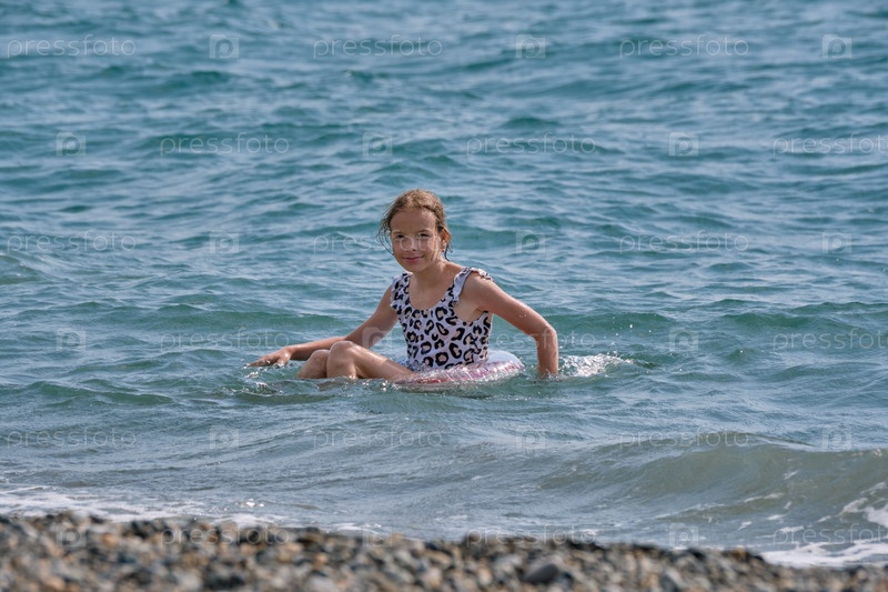 Улыбающаяся, счастливая девочка-подросток плавает в море или бассейне на надувном кольце