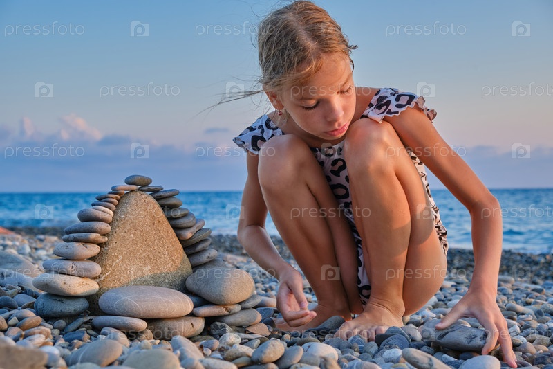 Ребенок в купальнике на берегу моря играет с галькой и строит башню из камней