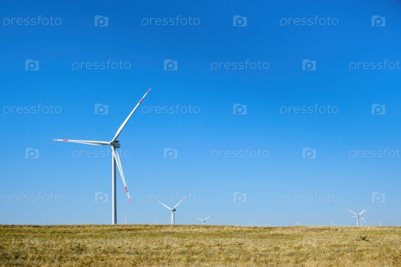 Ветровые турбины в поле на фоне голубого неба летом