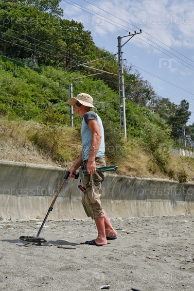 Мужчина с металлоискателем на песчаном пляже днем летом
