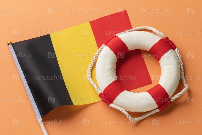 Флаг Бельгии и спасательный круг на цветном фоне, концепция на тему помощи, вид сверху