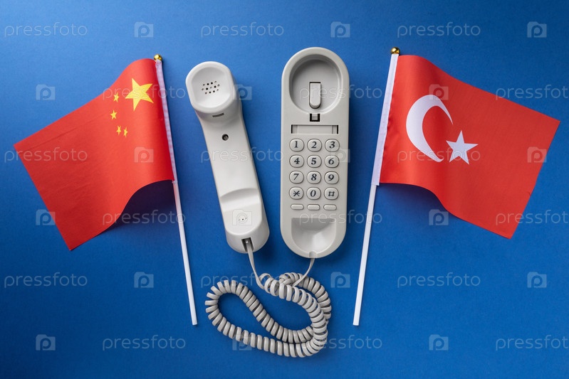 Флаг Китая, Турции и старый проводной телефон на синем фоне, концепция на тему телефонных разговоров между странами