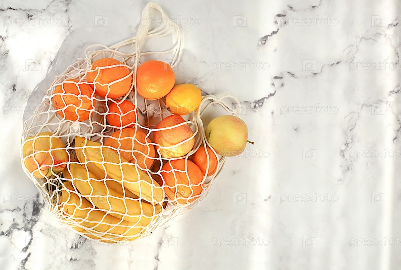 Диетические фрукты в тканевой упаковке. Баннер для магазина. Здоровые натуральные продукты в эко-сумке для повышения иммунитета, концепция здорового образа жизни, нулевые отходы. Нет пластика