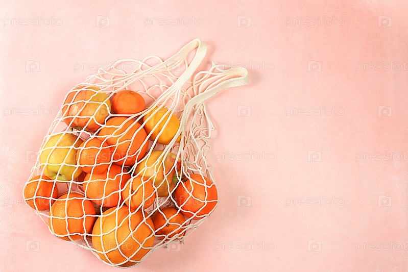 Диетические фрукты в тканевой упаковке. Баннер для магазина. Здоровые натуральные продукты в эко-сумке для повышения иммунитета, концепция здорового образа жизни, нулевые отходы. Нет пластика