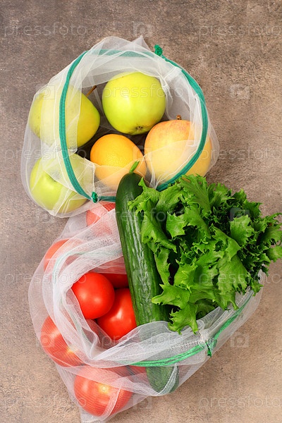 Здоровые натуральные продукты в эко-сумке для повышения иммунитета, концепция здорового образа жизни, нулевые отходы. Диетические фрукты и овощи в тканевой упаковке. Баннер для магазина. Нет пластика