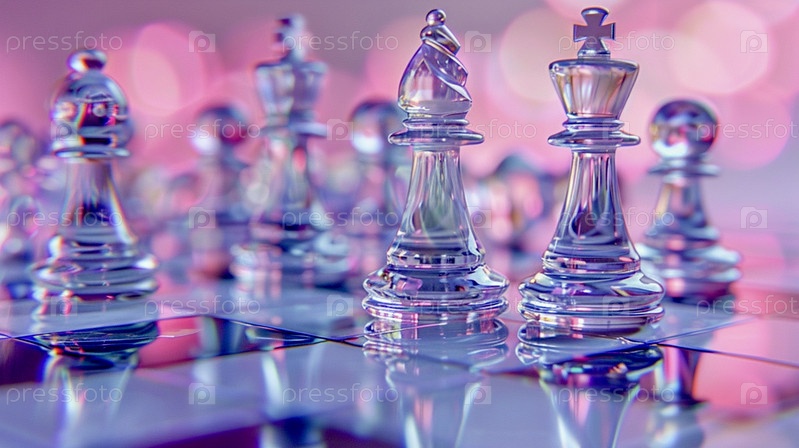 Абстрактный фон в виде стеклянных шахматных фигур на синей, розовой и малиновой шахматной доске