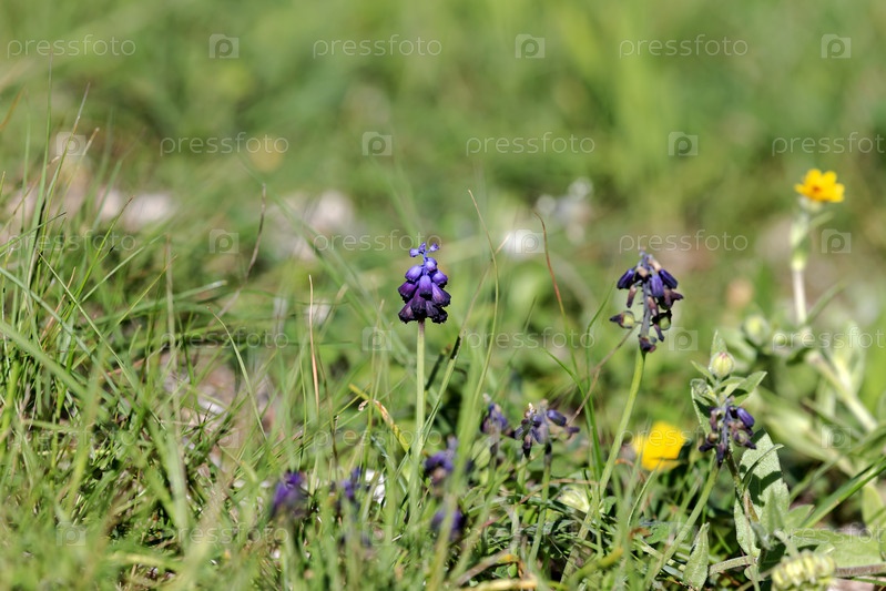 Растение (Мускари) с фиолетовыми цветами растет крупным планом