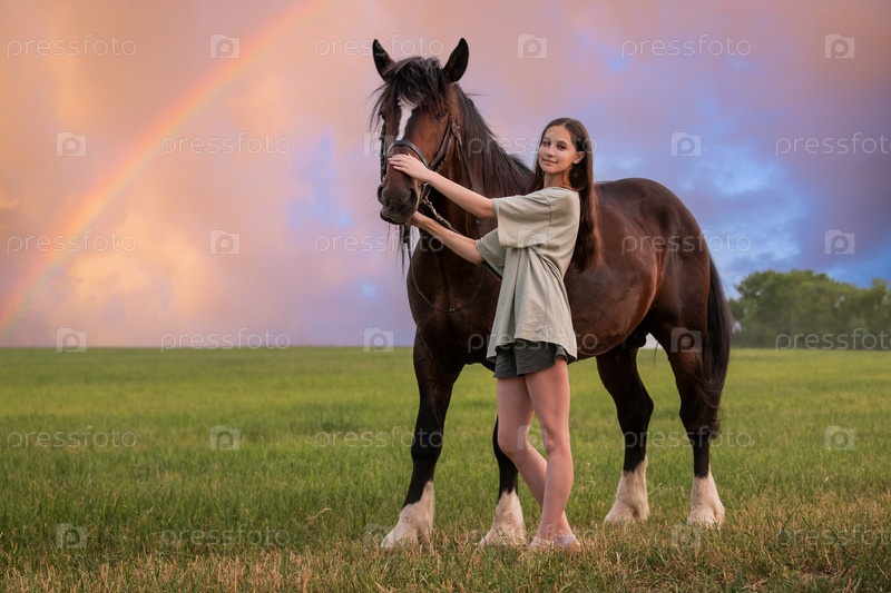 Девушка стоит рядом с лошадью в поле. Небо наполнено радугой, создавая красивую и умиротворяющую атмосферу
