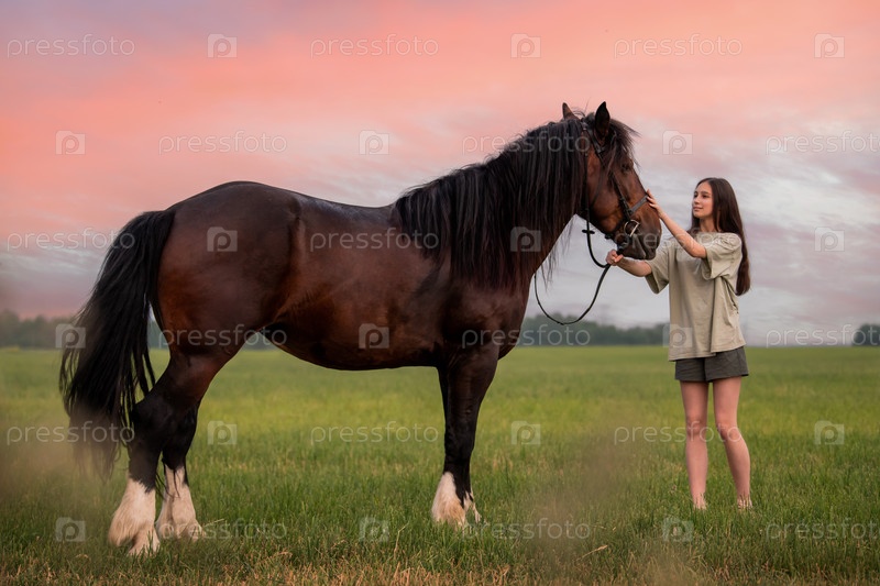 Девушка стоит рядом с лошадью в поле. Небо наполнено радугой