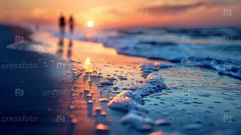 Берег океана, силуэты людей, идущих по берегу, закат, мягкий фокус