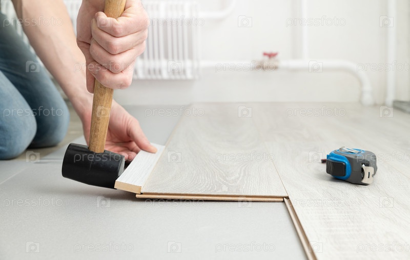 Мужчина укладывает ламинат на пол, забивая его резиновым молотком