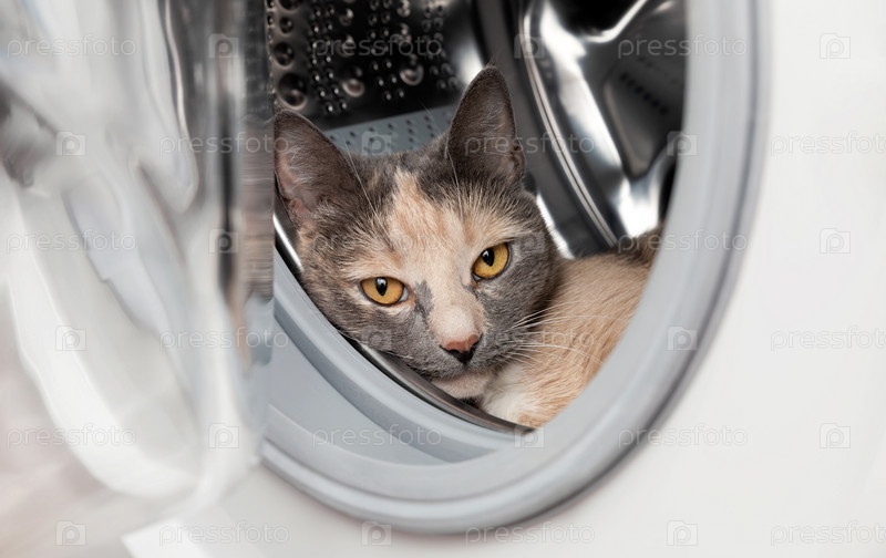 Домашняя кошка лежит в стиральной машине