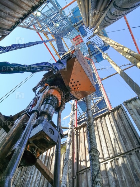 Внутреннее устройство буровой установки. Верхний силовой привод буровой установки, оборудование для спуска и подъема труб. Бурильные трубы установлены вертикально