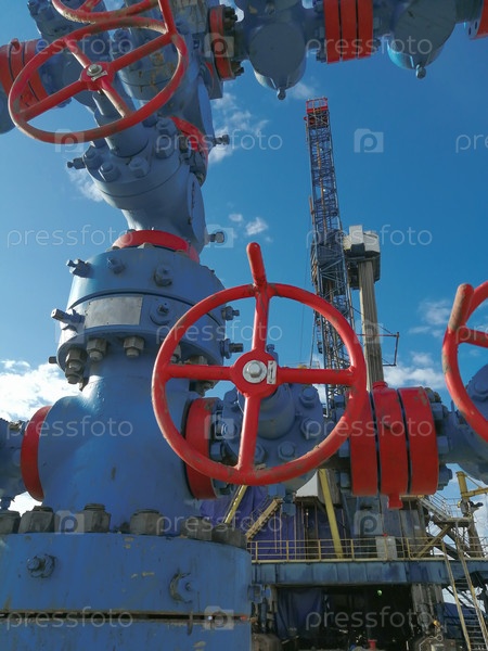 Фонтанная арматура газовой скважины с маховиками задвижек высокого давления. На заднем плане буровая установка. Некоторые детали композиции размыты. Летний день, голубое небо