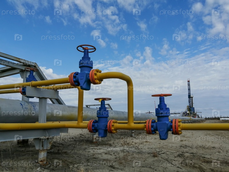 Трубопроводная арматура и манифольд добывающих газовых скважин на месторождении. Маховики для клапанов высокого давления. На заднем плане буровая установка. Размытие удаленных объектов
