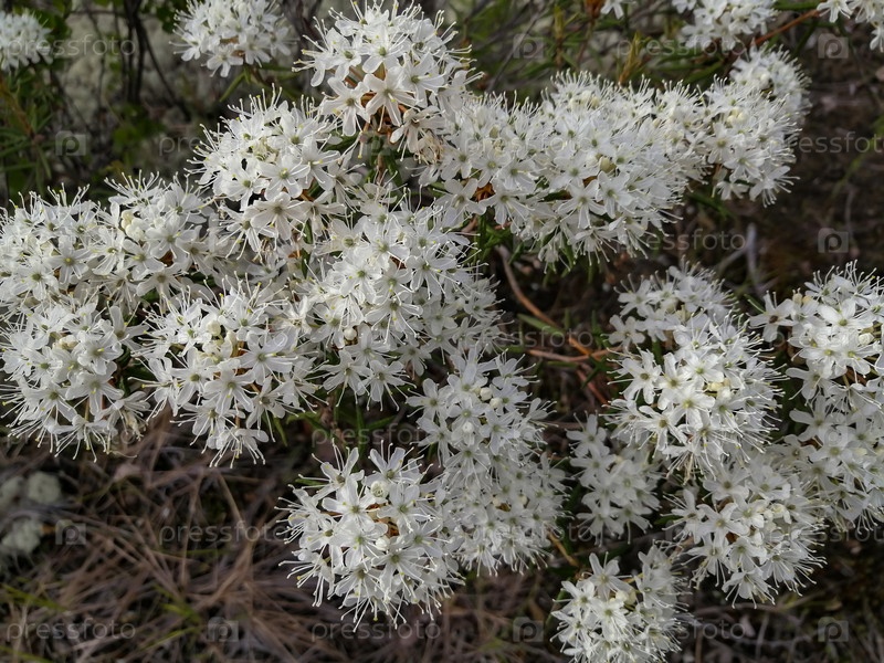 Маленькие белые соцветия кустарника багульника из семейства вересковых рода рододендронов, растущего в северной тундре. Летняя природа тундры. Уникальная полярная флора