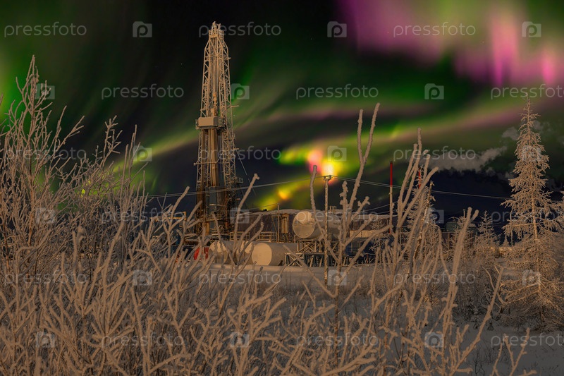 Полярная ночь. Зимний пейзаж с буровой установкой на северном месторождении нефти и газа. На заднем плане красивое небо с северным сиянием