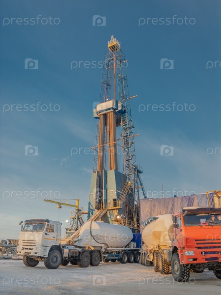 На заднем плане буровая установка на северном нефтегазовом месторождении. На переднем плане – технология тампонажного цементирования обсадной колонны скважины
