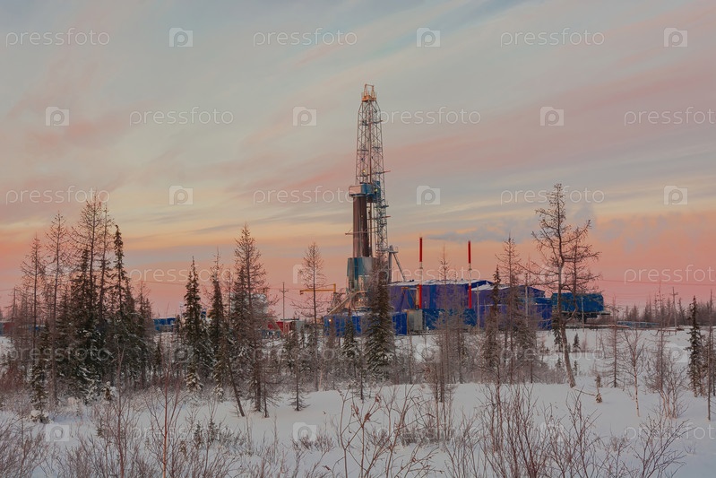 Пейзаж северного ландшафта нефтегазового месторождения с буровой установкой на фоне красивого неба. Зимний полярный день
