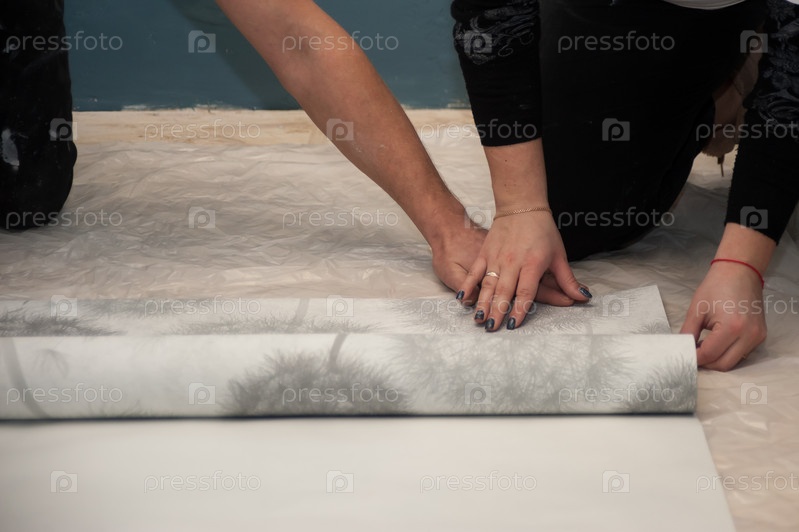 Пара, мужчина и женщина наклеивают обои