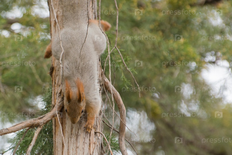 Серая белка лазит по голым деревьям весной
