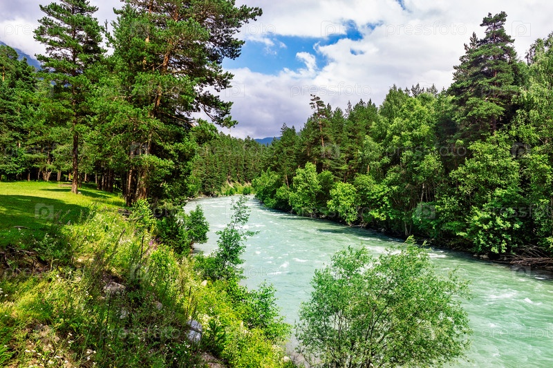 Река Большой Зеленчук в горах Кавказа в солнечный день
