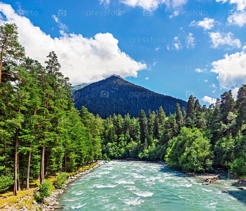 Река Большой Зеленчук в горах Кавказа в солнечный день