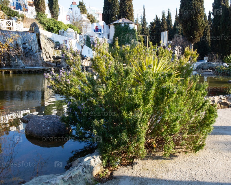 Куст с распускающимися листьями на берегу пруда весной в старом парке города Алушты в Крыму