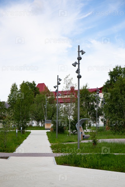 Каменная пешеходная дорожка на площади Геологов в Ноябрьске летом