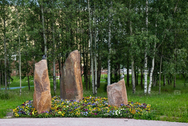 Каменные столбы на площади Геологов в Ноябрьске летом