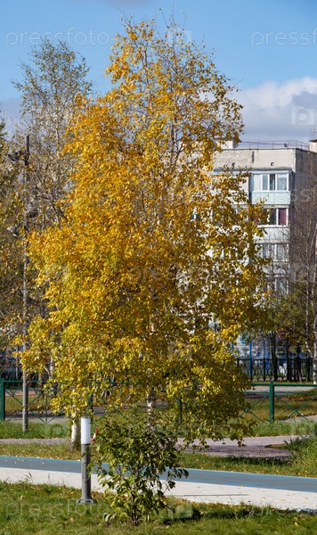 Осенняя береза с желтыми листьями в центре Ноябрьского Ямала