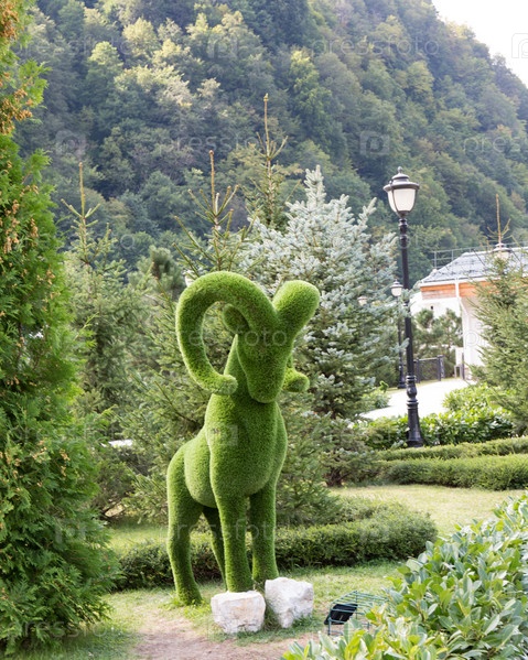 Зеленая скульптура горного козла в Красной Поляне в Сочи летом