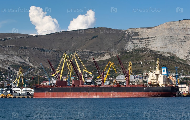 Торговое судно в бухте города Новороссийска на рейде летом