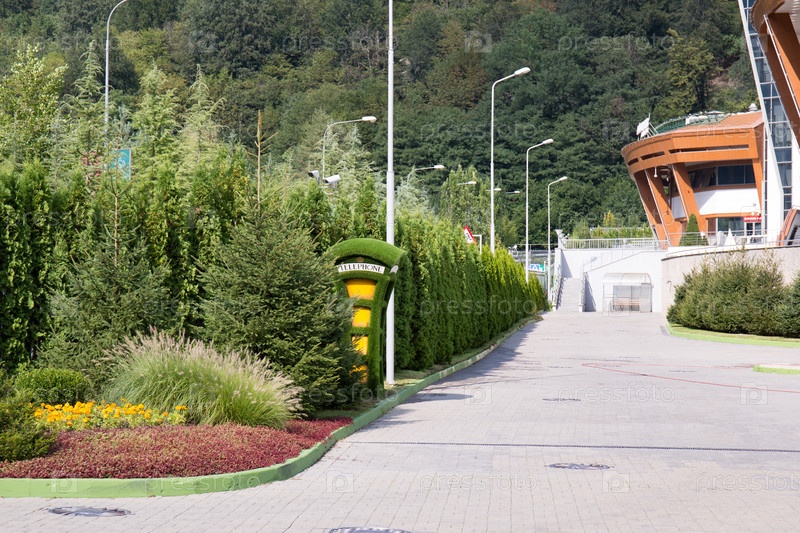 Зеленая скульптура телефонной будки в Красной Поляне в Сочи летом