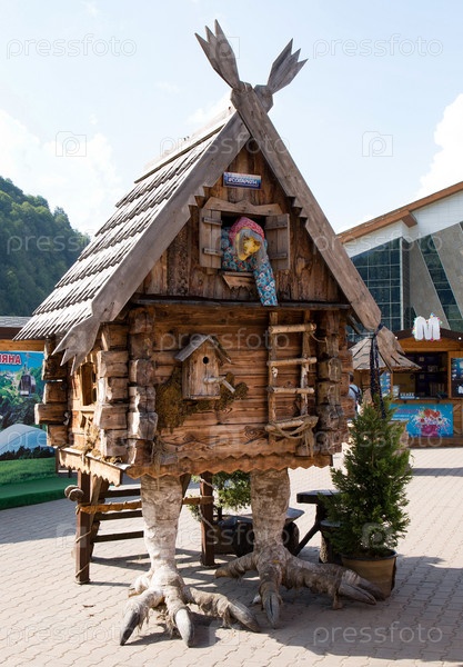 Скульптура избушки на курьих ножках с Бабой Ягой в Красной Поляне в Сочи летом