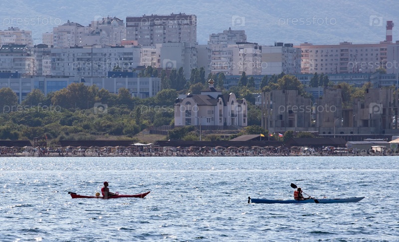 Красивые каяки на фоне набережной в бухте Новороссийска летом