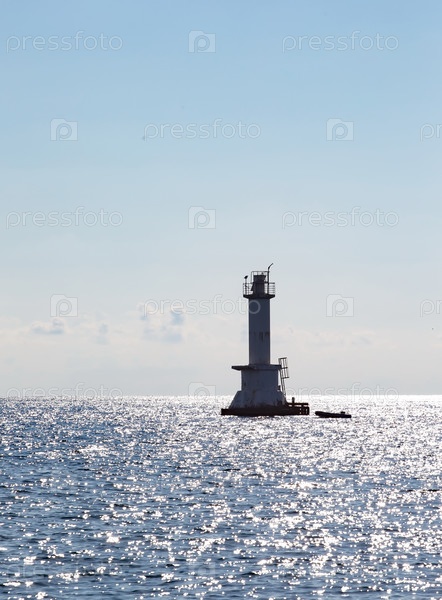 Красивый маяк в бухте города Новороссийска в яркий солнечный день летом