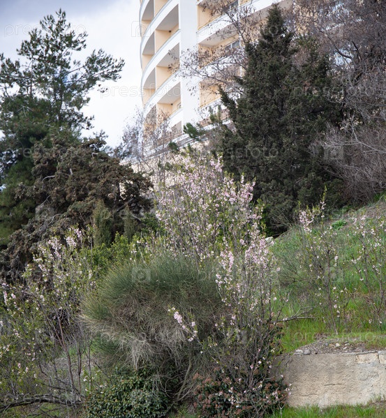 Цветущий куст весной среди бетона и деревьев в старом парке в городе Алушта, Крым