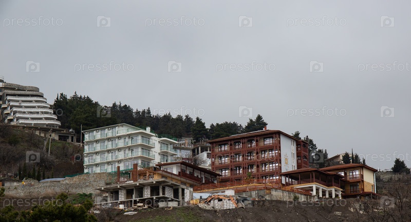 Прекрасный вид на здание на горе весной в городе Алушта в Крыму