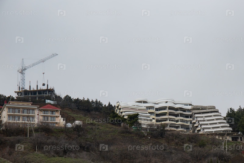 Прекрасный вид на здание на горе весной в городе Алушта в Крыму
