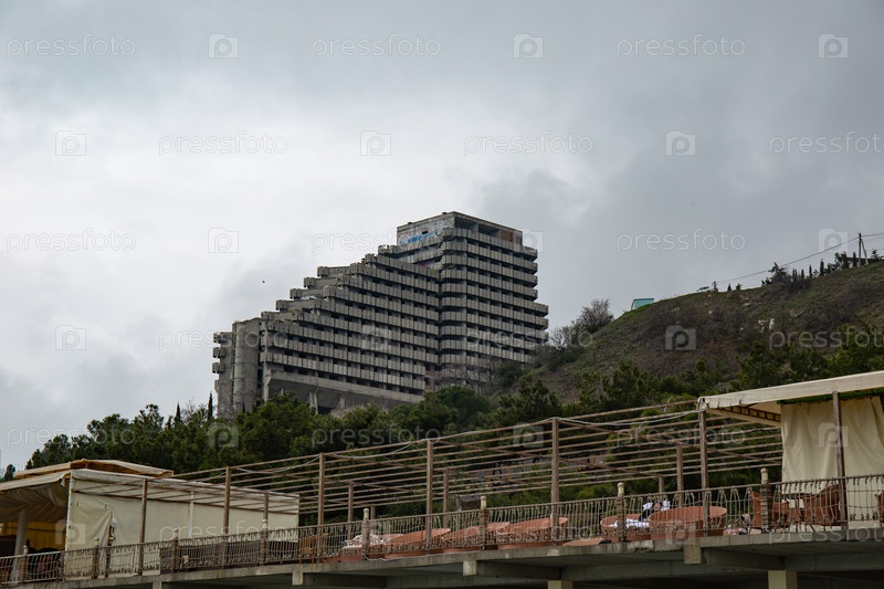 Прекрасный вид на здание на горе весной в городе Алушта в Крыму