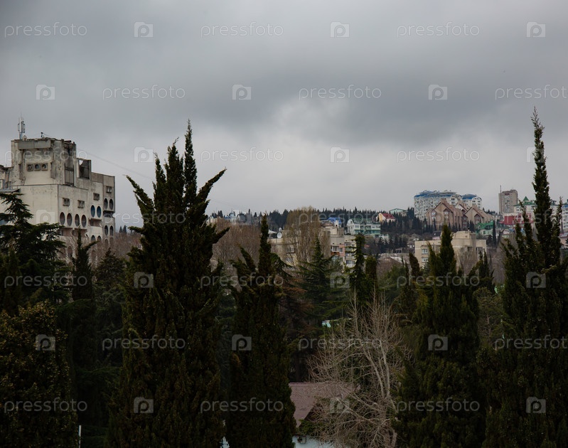 Облака над зданиями, скрывающими горы весной в городе Алушта в Крыму