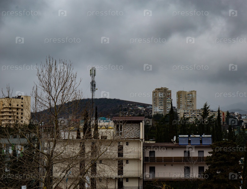Облака над зданиями, скрывающими горы весной в городе Алушта в Крыму