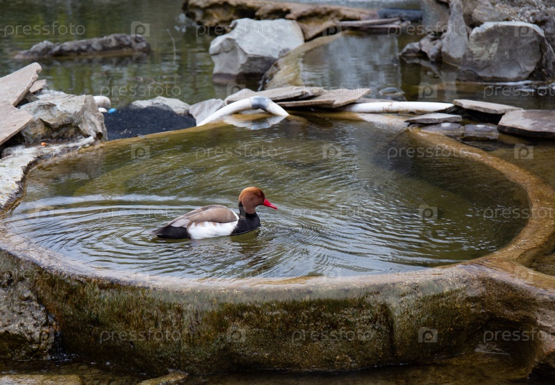Красивая утка в небольшом пруду в старом парке города Алушты в Крыму