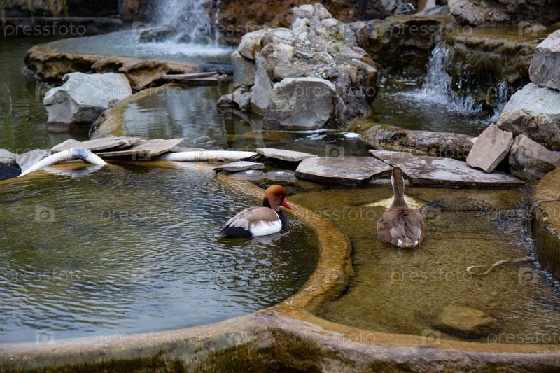 Красивая утка в небольшом пруду в старом парке города Алушты в Крыму