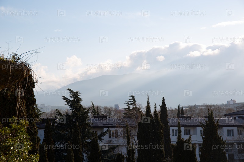 Облака над зданиями, скрывающими горы весной в городе Алушта в Крыму