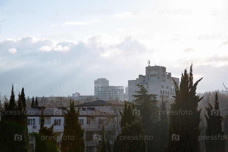 Облака над зданиями, скрывающими горы весной в городе Алушта в Крыму