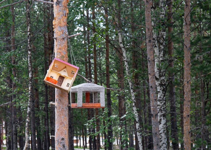 Красивые кормушки для птиц на дереве в центральном парке города Ноябрьска летом