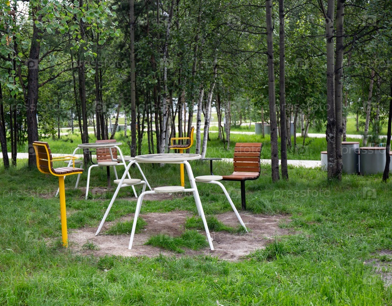 Оригинальная композиция в виде стола и стульев на площади Геологов в городе Ноябрьске летом