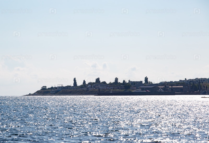 Вид на красивые здания на набережной города Новороссийска из бухты летом